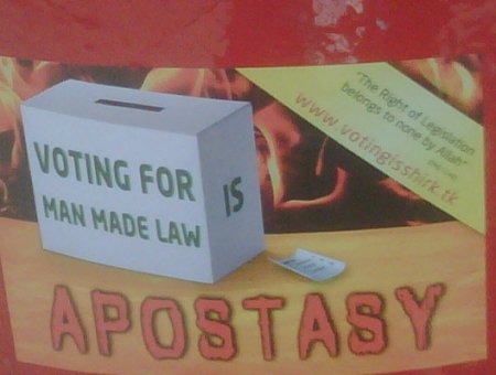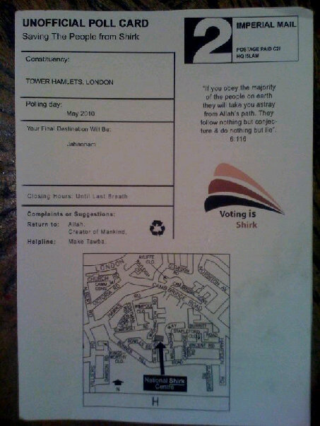 Meanwhile, some people are trying to convince Muslims in East London that to vote on May 6th means that you become an apostate (a renegade from Islam) and will end up in Hell! Have a look at these leaflets or flyers, one from Leyton and one from Tower Hamlets: