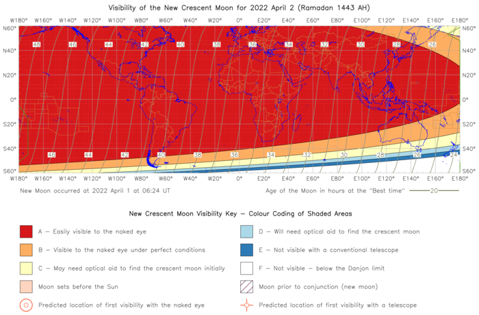 Global new (crescent) moon visibility for the evening of Saturday 2 April, 2022 (30th Sha’ban 1443):