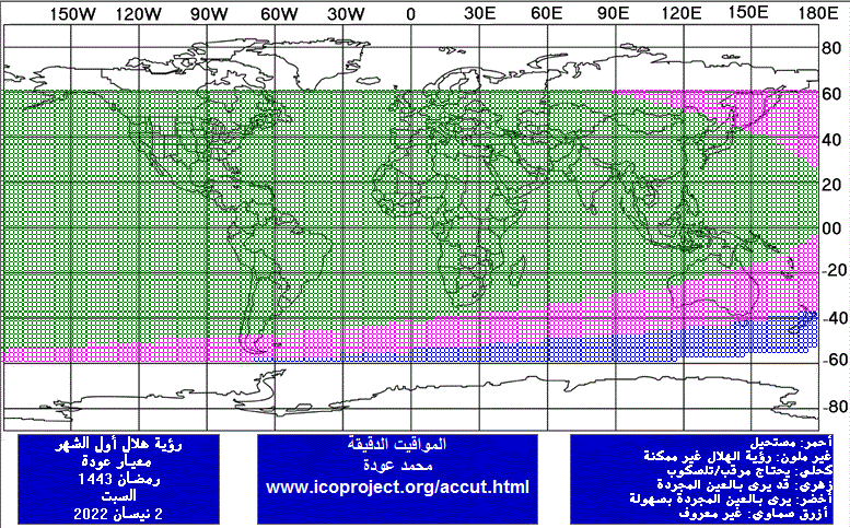 SUMMARY: Naked-eye moonsighting gives the 1st day of Ramadan 1443 as Sunday 3 April 2022 for the whole world except for North America where Saturday 2 April 2022 is a possibility. Moonsighting with a telescope gives the 1st day of Ramadan 1443 as Saturday 2 April 2022: some authorities and countries have already announced Ramadan for then. (Naked-eye moonsighting in Antarctica & New Zealand might give the 1st day as Monday 4 April 2022!)
