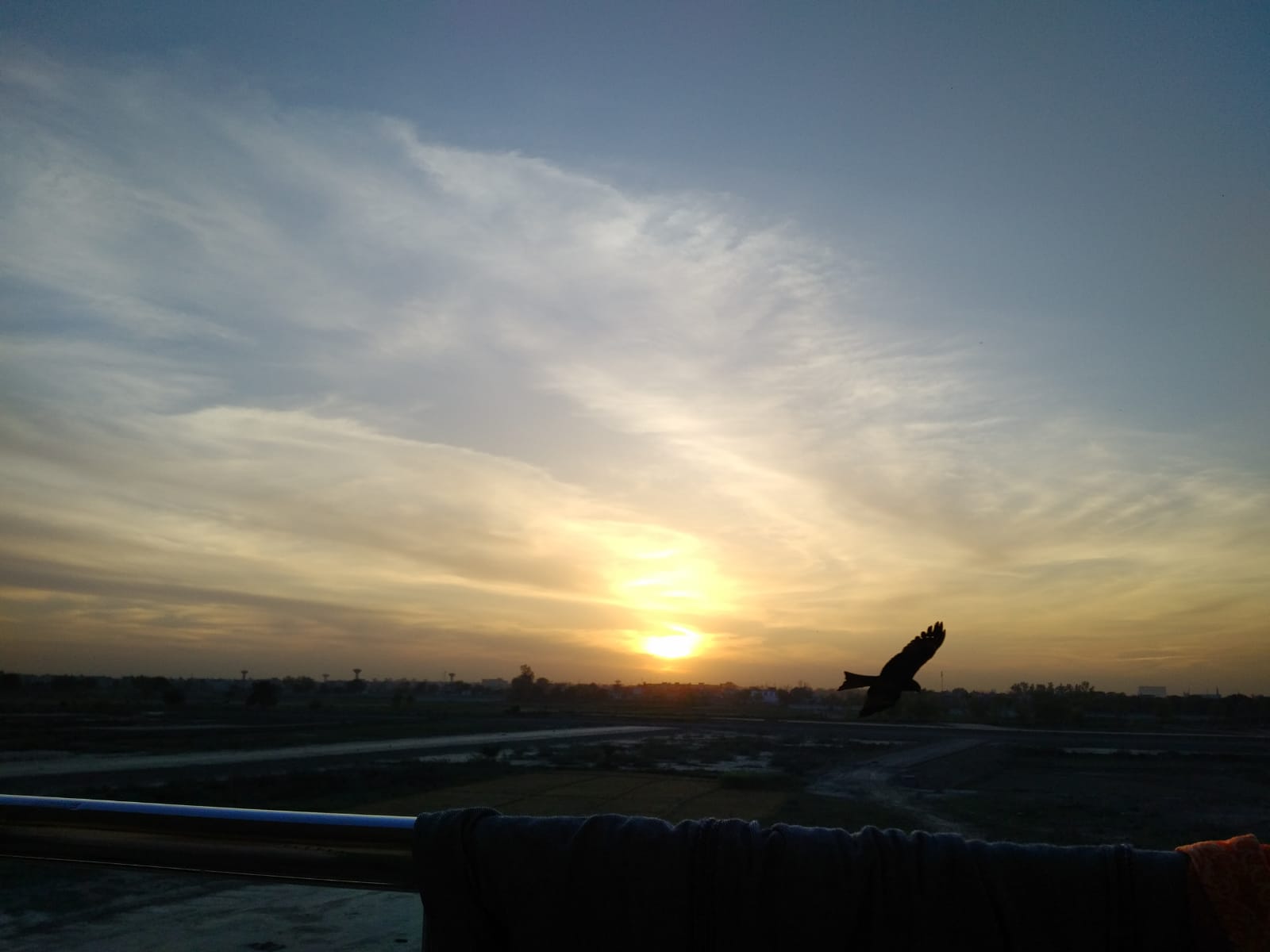 Brown Hawk over Lahore sunset, taken from the balcony opposite Amatul-Haseeb’s room, 4th April 2019, five months before her departure from this world. Photo: (c) Usama Hasan